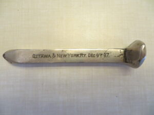 “The Last Spike” driven in the Ottawa & New York Railway line between Cornwall and Ottawa that is dated for Dec. 9, 1897. The ceremony did not happen then and it is suspected that the ceremony was private occurring somewhere along the line between Cornwall and Cornwall Junction at a later date. There may have been a second Last Spike ceremony that occurred in the Ottawa area at the same time. It has been reported that the possible second Last Spike is at the Keith Boyd Museum in Russell.